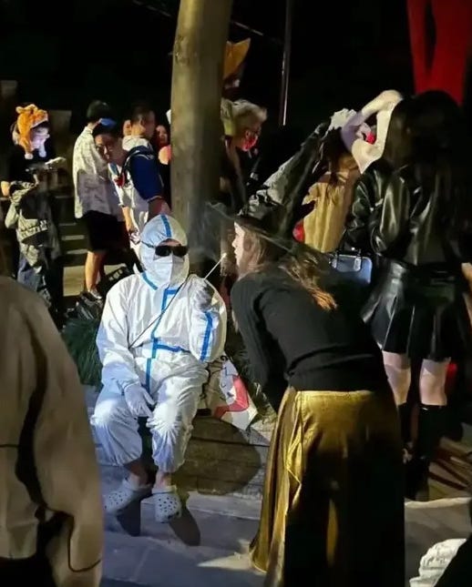 10月29日周日深夜,乌云下班来到上海成都南路一带。看着眼前摩肩接踵的“万圣变装”人潮,与两端路口把守的警察谨慎地保持距离,她仿佛又回到了去年11月27日上海乌鲁木齐中路的街头。两地不过相隔几公里。她内心隐约期待,会在人群中看到“白纸”相关的变装表达,却遗憾落空。