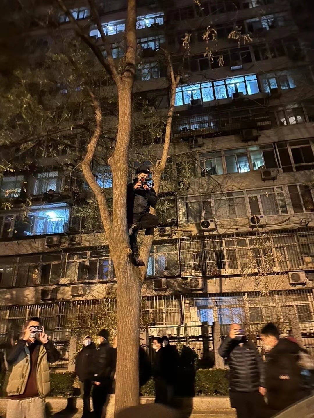 人群行进到一座桥下发现前面没路了,左转进入了另一条路,柯柯和朋友突然站到了第一排。许多外媒记者拿着长枪短炮对着他们拍照,有人爬上树俯拍,随着人群向前的还有一边戴着N95口罩的便衣。晓祺听站在人群里的同行说,“中国记者把自己献祭出去,让外国记者拿荷赛(世界新闻摄影奖)。”其他人都笑了起来。她还看见了一个怪异的采访现场。受访人的同伴站在左右两边,用两张白纸把ta的脸捂住,记者把话筒从白纸的缝里伸进去采访。