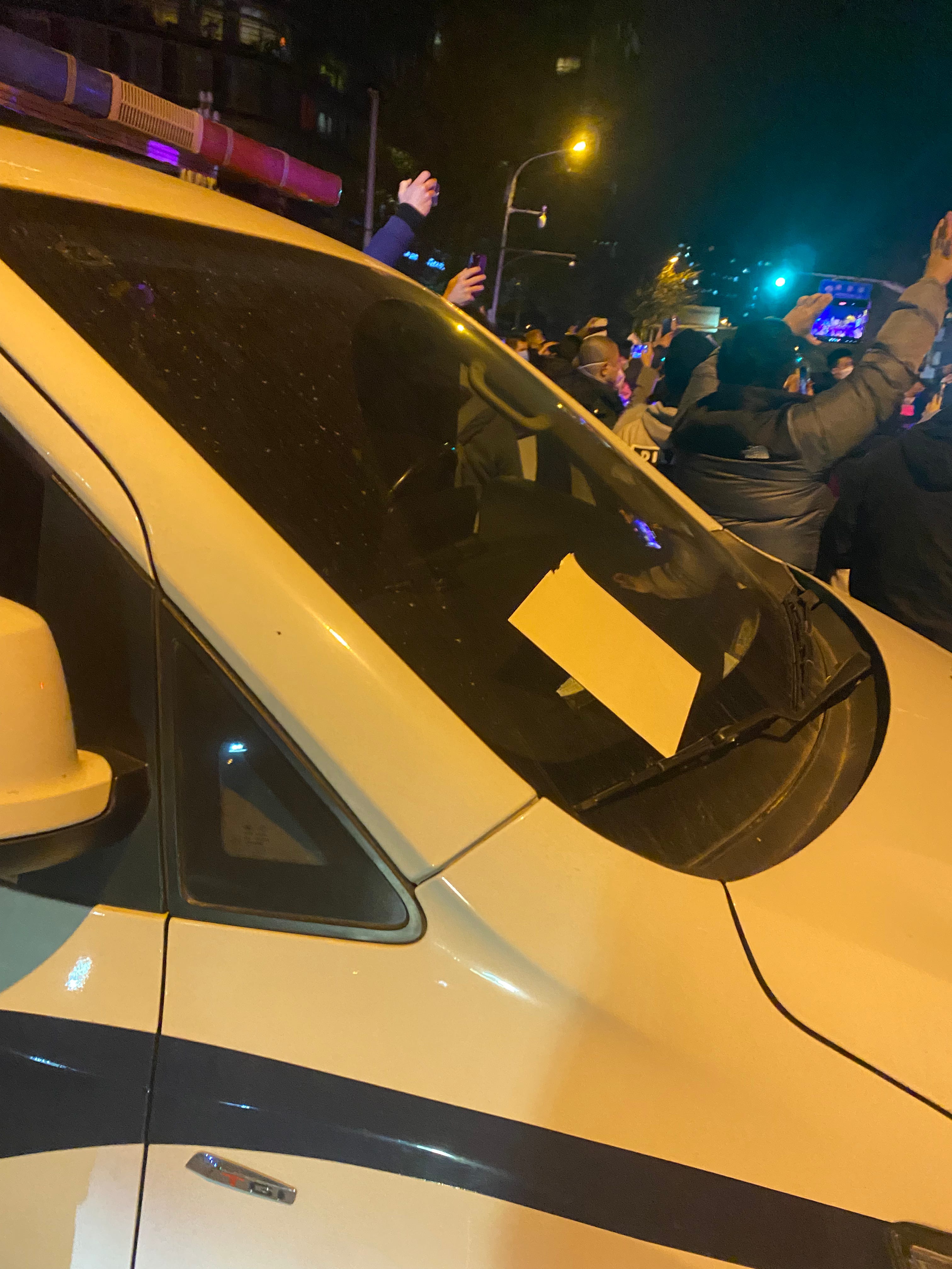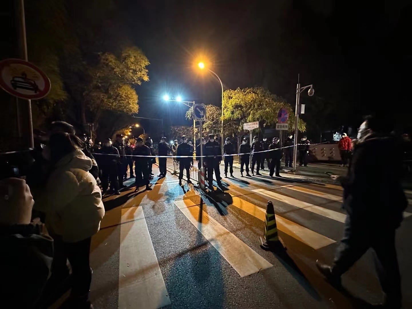 一个年轻的男警察出来劝说人群,说我理解大家心情,但现在毕竟还在疫情期间,大家能不能散开。现场的人并不买账,回呛说那我们就像排队做核酸一样排队悼念嘛。有人问他,你知道我们为什么在这里悼念吗,你知道乌鲁木齐发生了什么事情吗,他说不知道。人群中蔓延着强烈的情绪,有人质问他,你怎么不知道这件事情,你还是人民公仆。