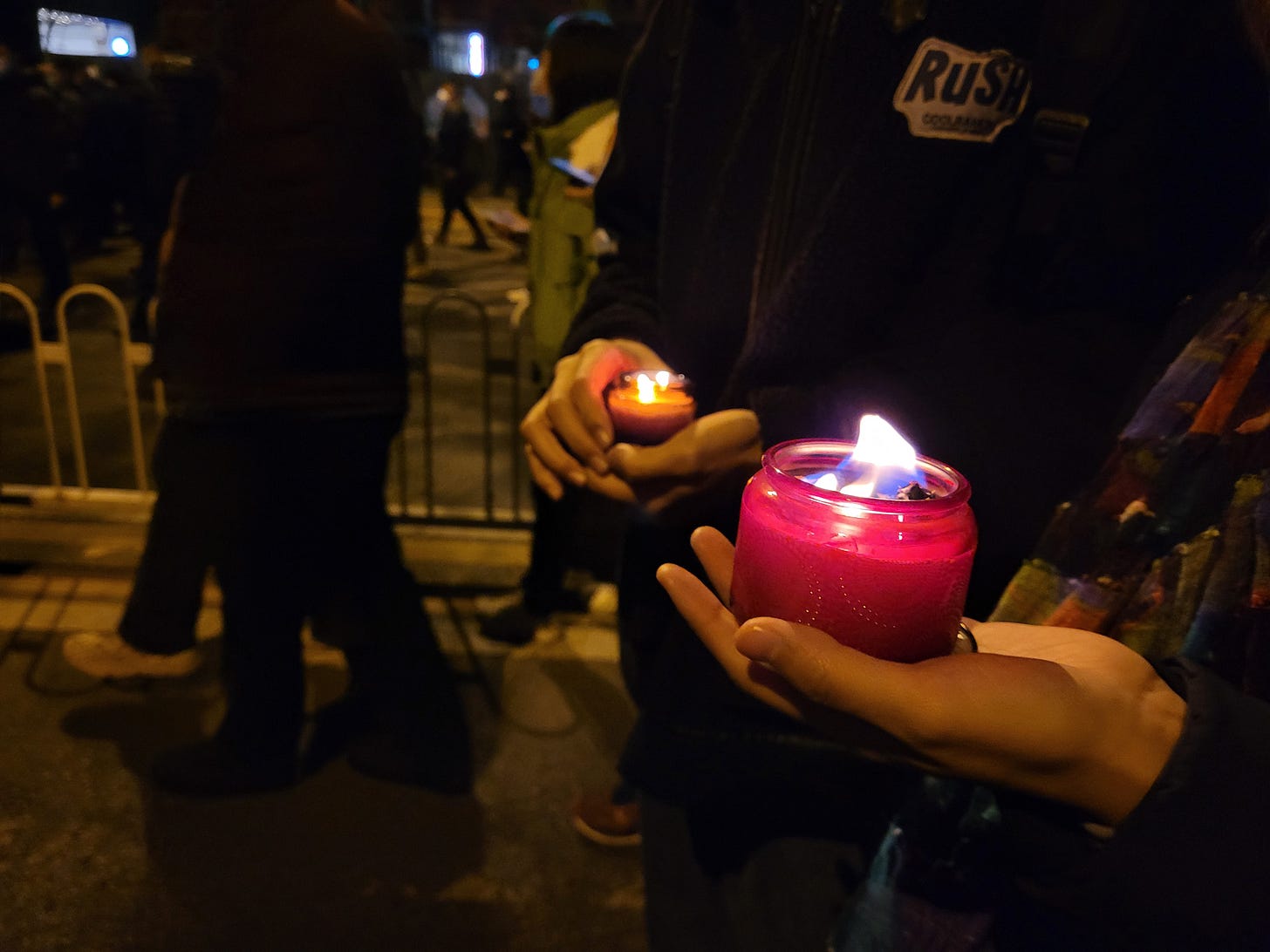 伍涯看到南传和上海先后出现白纸运动,想在社交媒体上寻找北京的纪念活动,但一无所获。他觉得,发生了这么多苦难,应该有人去记住,哪怕可能意味着危险。他联合了几个朋友,准备做个小型的纪念活动。一开始地点定在乌鲁木齐驻京办,泄漏后改到了亮马桥。他不会想到,来到现场的人多到挤满亮马河岸的栈道。伍涯几个小时内就准备好了蜡烛和白纸,买了一个便宜的安全手机。他又想到2020年弦子案开庭,去声援的伙伴说晚上很冷,就带上了一些暖宝宝。