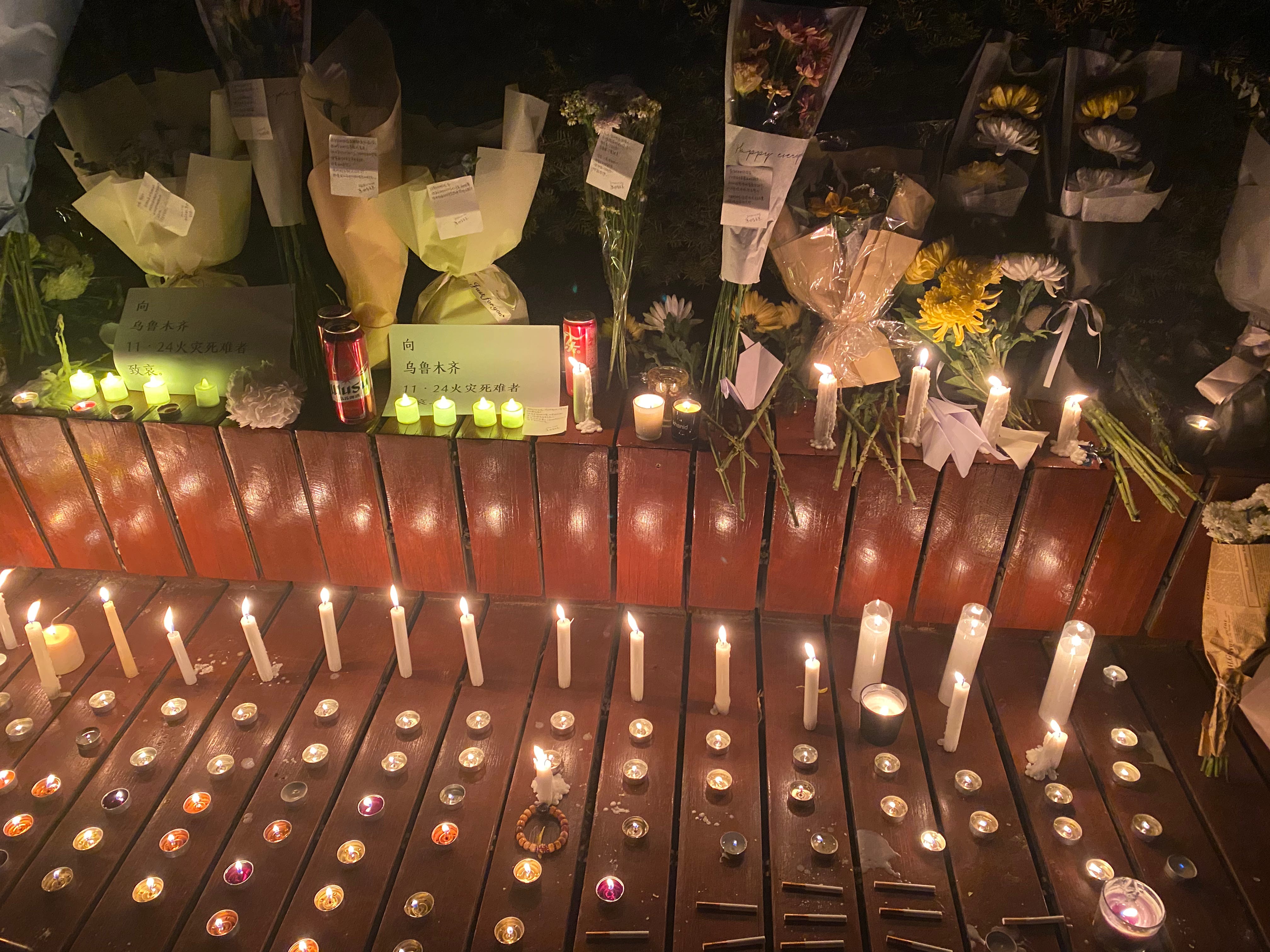 人群开始献花,唱《送别》。以一个花坛为中心,木质栈道上被摆上一行行五颜六色的蜡烛,用白纸折的千纸鹤和纸飞机散落在花束间。一个女生隔着花坛,说自己是新疆人,她很谢谢大家。晓祺默默在心里说,是汉人对不起新疆人。