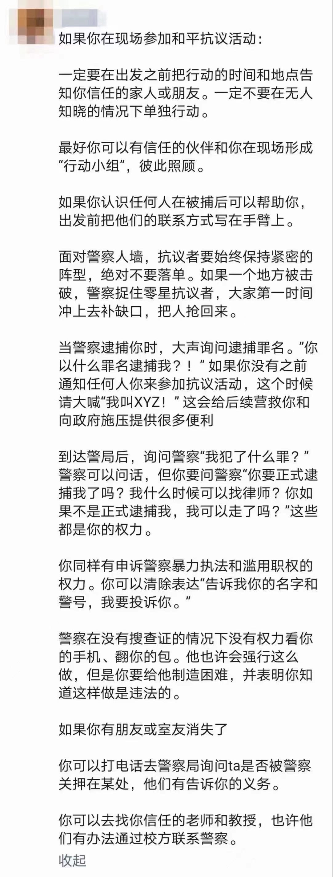 她还喊了很多朋友一起来。有个在体制内媒体工作的朋友来到了现场,但待了不久就离开了。ta非常恐惧, ta也很想留在现场,但是ta会想到不能失去工作。还有一些年纪稍大的朋友,他们在职业生涯中本身已经受到过很大的伤害,生活刚刚才回到一个平静的、不被骚扰的状态,没有办法承受去现场所带来的任何后果。但晓祺很久之后才知道,那天晚上,一个30多岁的朋友还是偷偷地去了现场,没有告诉任何人。