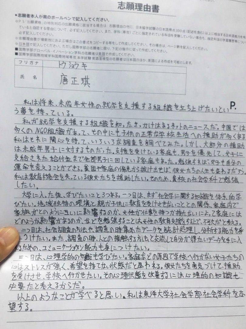 在首次大学申请的志愿书中,唐正琪写道,她从网络新闻获知有支援未成年人上学的NGO存在,但做了各种调查研究后发现,大部分援助都针对男孩,即使是接受支援的家庭,也都优先给男孩,甚至把女儿拿到的支援金全部拿给儿子。