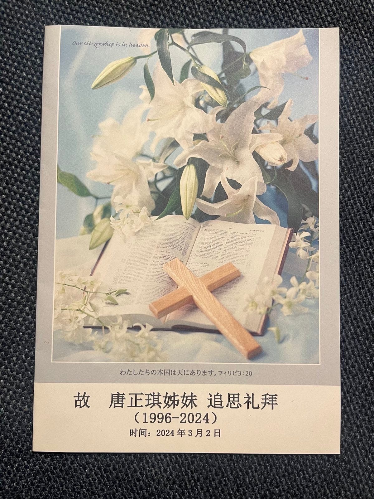 “主啊,你知我无良友像你,天堂若非我家,我必流离无依……”在一片唱诗和祷告声中,27岁的唐正琪(小名:琪琪,キキ)走完了在日本东京求学的最后一站。