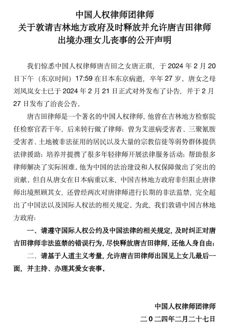 2024年2月20日,唐正琪于日本东京去世,享年27岁。在生前身后的报道里,她似乎一直只是“人权律师的女儿”。